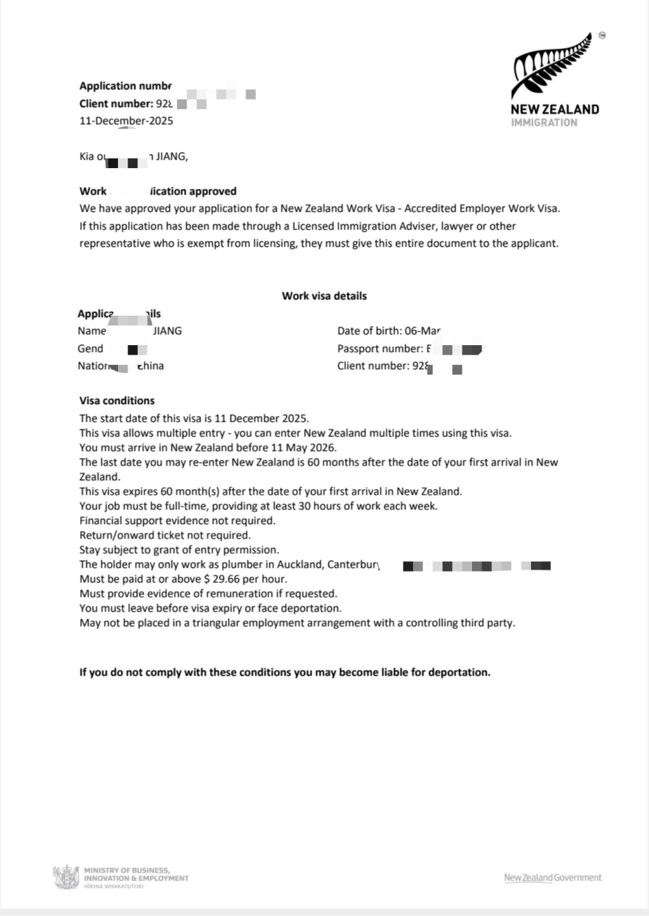 剛送走前幾天成功獲批的新西蘭技術工人,今天我們公司又迎來了一個重磅好消息 ——又一位水工師傅的新西蘭工作簽證順利下簽!短短時間內接連拿下新西蘭技工簽證,這不僅是客戶自身實力的體現,更是我們公司專業服務能力的有力證明!