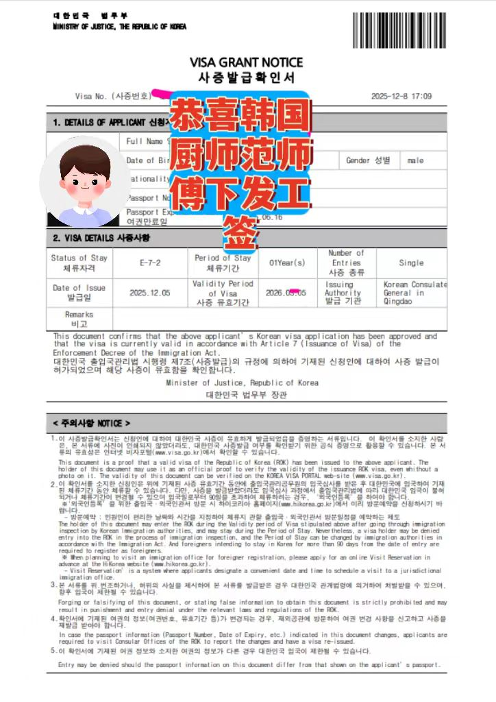 恭喜范師傅韓國(guó)廚師工作簽證成功下發(fā)!歷經(jīng)材料審核、雇主匹配、領(lǐng)館審批等全流程,正規(guī)廚師簽證順利到手,即將開(kāi)啟赴韓高薪工作之旅~